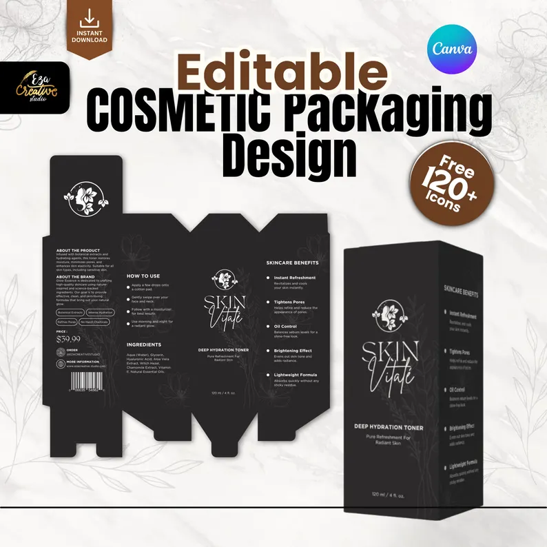 Editable Cosmetic Packaging Design Template | Skincare & Beauty Box Layout with Free 120+ Icons